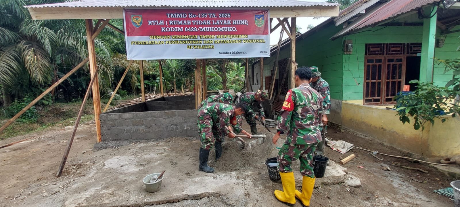 Lubuk Pinang, 29 Juli 2025 — Pembangunan Rumah Tidak Layak Huni (RTLH) yang menjadi sasaran fisik utama dalam program TMMD Reguler ke-125 Kodim 0428/Mukomuko terus dikebut. Memasuki hari ke-8 pelaksanaan TMMD, anggota Satgas fokus pada proses pembuatan tembok rumah di Desa Sumber Makmur SP 8, Kecamatan Lubuk Pinang.