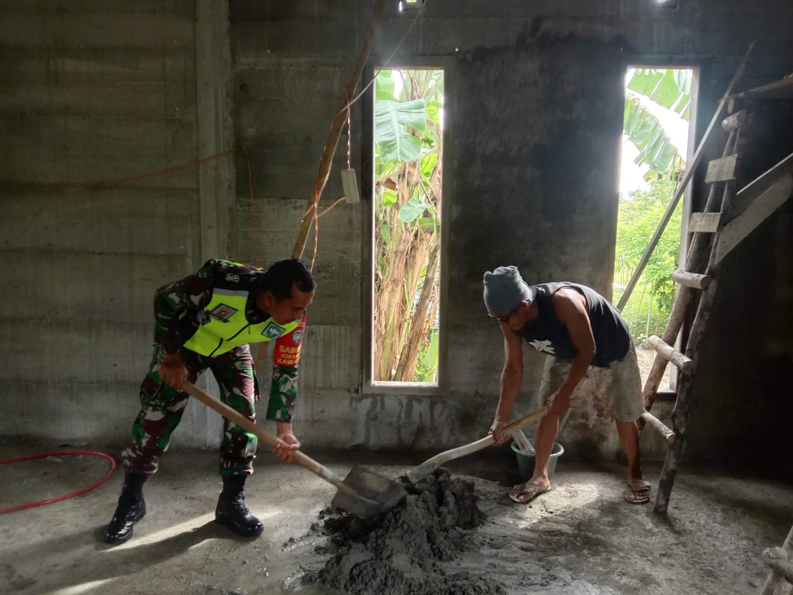 ACEH BARAT – Babinsa Koramil 03 Kaway XVI Kodim 0105 Abar Sertu Ariyanto membantu warga buat aduk semen untuk plaster rumah warga di Desa binaanya di Desa Blang Dalam Kecamatan Kaway XVI, Kabupaten Aceh Barat. Senin (24/02/2025).