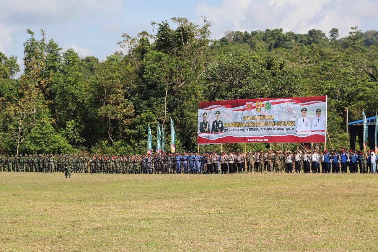 Konawe – Penutupan TMMD ke-125 Kodim 1417/Kendari di Desa Awua Jaya, Kecamatan Asinua, menandai berakhirnya program yang selama sebulan penuh memberi dampak besar bagi masyarakat. Program yang ditutup Kamis (21/8) ini berhasil menyelesaikan berbagai sasaran pembangunan fisik dan nonfisik.