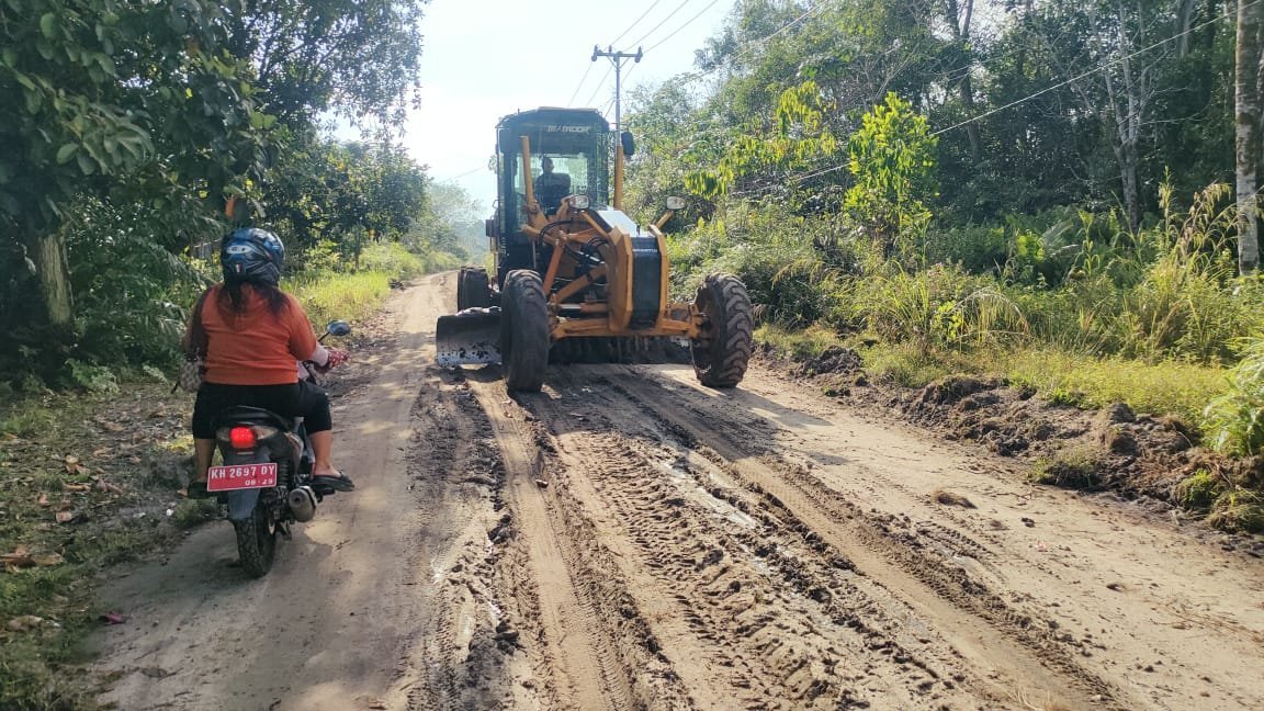 Pada Jumat (16/05/2025), alat berat jenis grader tampak beroperasi di lokasi untuk meratakan tanah, sebagai bagian dari proses perbaikan jalan. Kegiatan ini dilakukan guna memberikan kenyamanan dan kelancaran bagi masyarakat saat melintasi jalur tersebut.