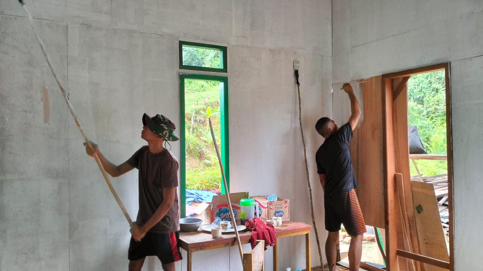 KUTAI TIMUR – Di Desa Suka Rahmat, Kecamatan Teluk Pandan, suara palu dan kuas cat kini menjadi irama harapan. Program TNI Manunggal Membangun Desa (TMMD) Ke-125 Kodim 0909/Kutai Timur terus menggenjot pengerjaan perehaban Rumah Tidak Layak Huni (RTLH) milik Rahman, yang kini memasuki tahap pemasangan plafon dan pengecatan dasar dinding atau plamir.