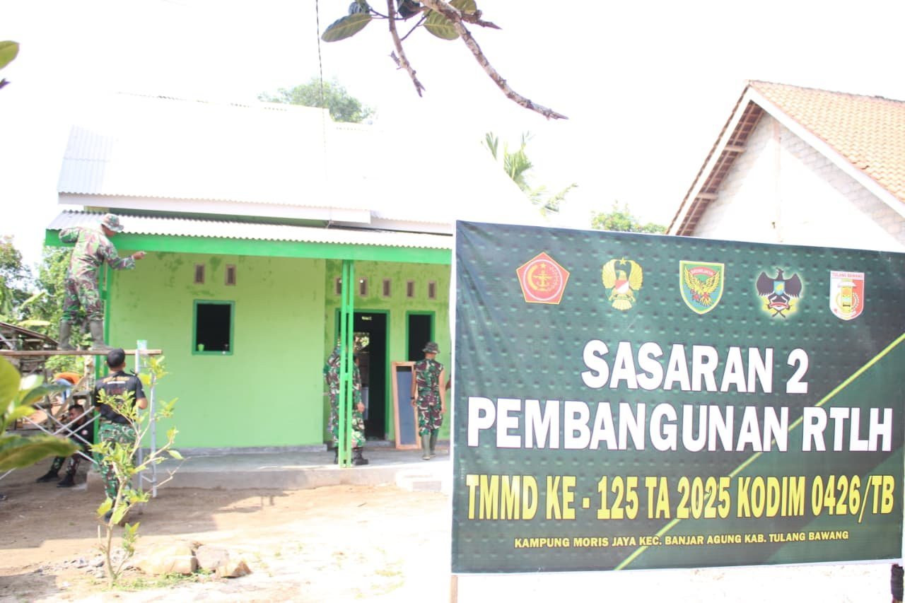 Tulang Bawang – Program TNI Manunggal Membangun Desa (TMMD) ke-125 di Kampung Moris Jaya, Kecamatan Banjar Agung, Kabupaten Tulang Bawang, terus menunjukkan progres positif. Pada Jumat (15/8/2025), Satgas TMMD fokus mengerjakan dua tahap penting dalam rehab Rumah Tidak Layak Huni (RTLH) sasaran 2, yaitu pengecatan garis plang dan melanjutkan pemasangan jendela.