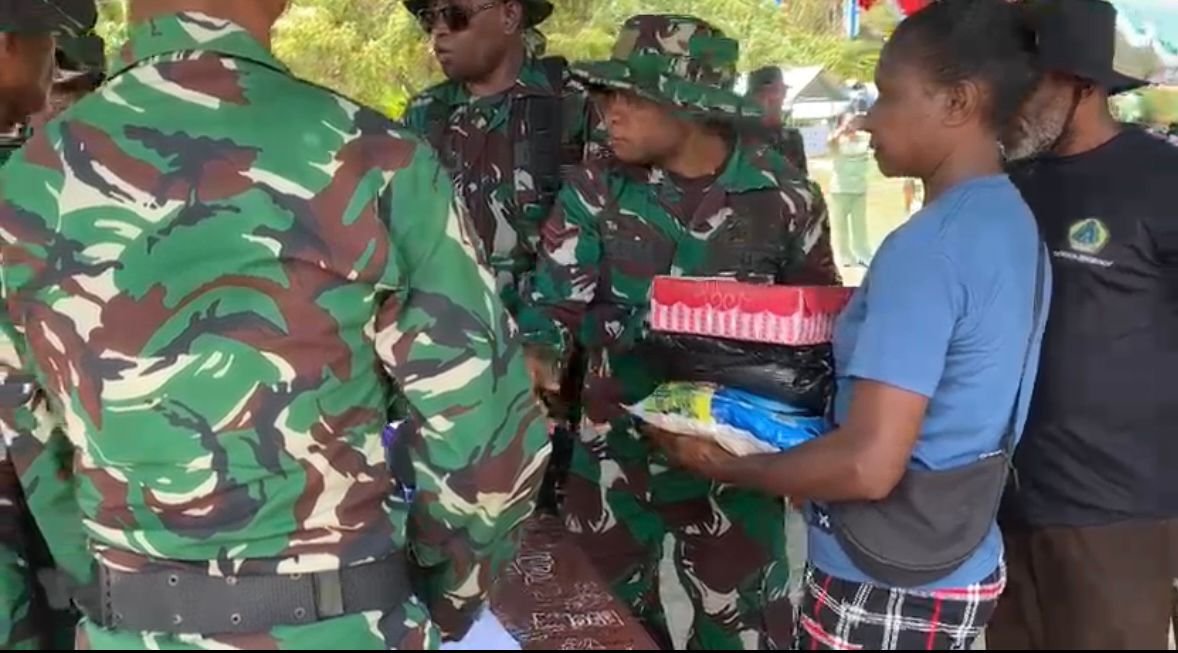 Kaimana – Program TNI Manunggal Membangun Desa (TMMD) ke-127 tidak hanya fokus pada pembangunan infrastruktur, tetapi juga melaksanakan berbagai kegiatan sosial yang memberikan manfaat bagi masyarakat. Salah satu kegiatan tersebut adalah pembagian sembako kepada penduduk di Kampung Marsi, Distrik Kaimana, Kabupaten Kaimana.