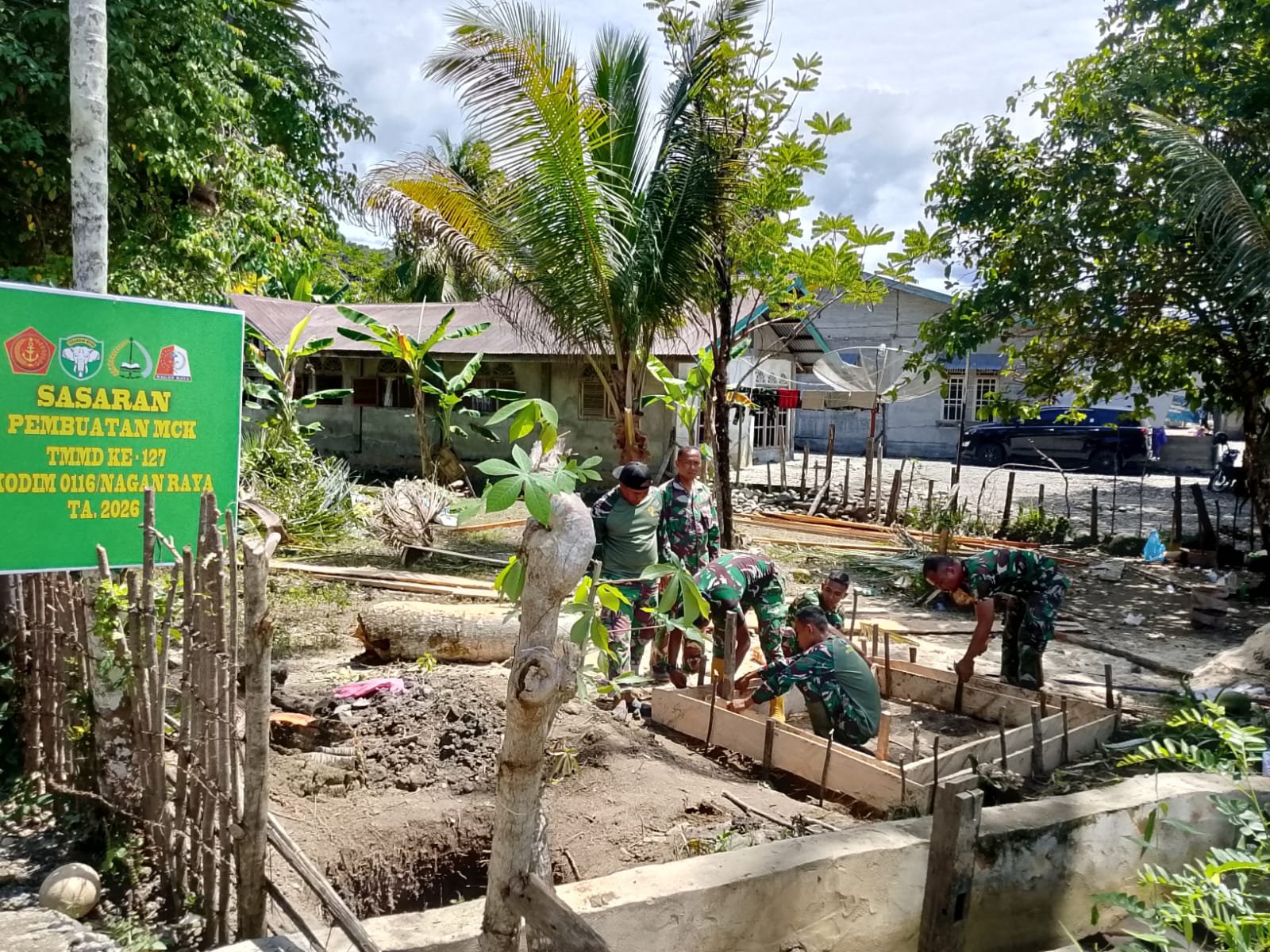 NAGAN RAYA – Program TNI Manunggal Membangun Desa (TMMD) Ke-127 yang dilaksanakan oleh Kodim 0116/Nagan Raya terus menunjukkan progres di lapangan. Salah satu sasaran tambahan berupa pembangunan Mandi Cuci Kakus (MCK) kini memasuki tahap awal, yakni pembuatan mal pondasi.