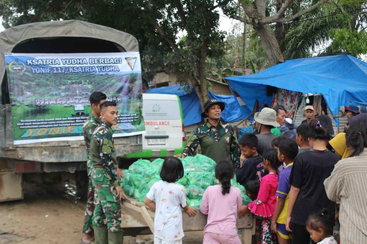 Aceh Tamiang – Sebagai wujud kepedulian TNI Angkatan Darat terhadap masyarakat yang terdampak bencana alam, prajurit Batalyon Infanteri 117/Ksatria Yudha melaksanakan kegiatan Jumat Berkah dengan menyalurkan bantuan kepada warga korban banjir di Kampung Durian, Kecamatan Rantau, Kabupaten Aceh Tamiang.