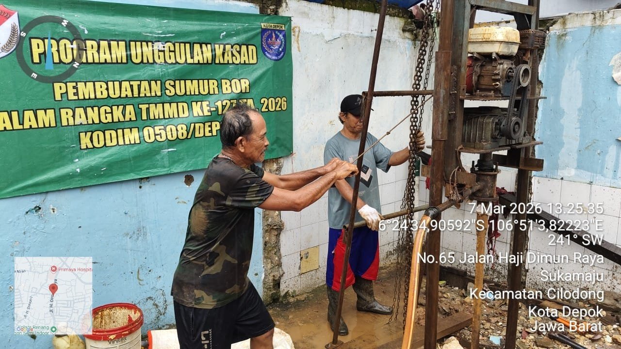 Depok – Pada hari ke-27 pelaksanaan TMMD Ke-127 TA. 2026, Kodim 0508/Depok berhasil menyelesaikan program unggulan TNI AD yang berfokus pada penyediaan air bersih. Pada Senin (09/03/2026), dilaporkan bahwa pembangunan sumur bor di Posyandu Mekarsari telah selesai 100%.