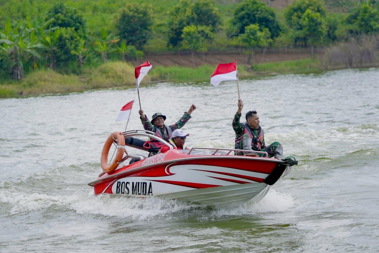 Suasana pagi itu terasa berbeda. Deretan perahu yang ditumpangi prajurit TNI melaju beriringan, membelah permukaan air yang tenang. Di tengah-tengahnya, bendera merah putih berkibar gagah. Sorot mata masyarakat yang menyaksikan dari tepian bendungan seolah tak lepas dari momen langka tersebut.