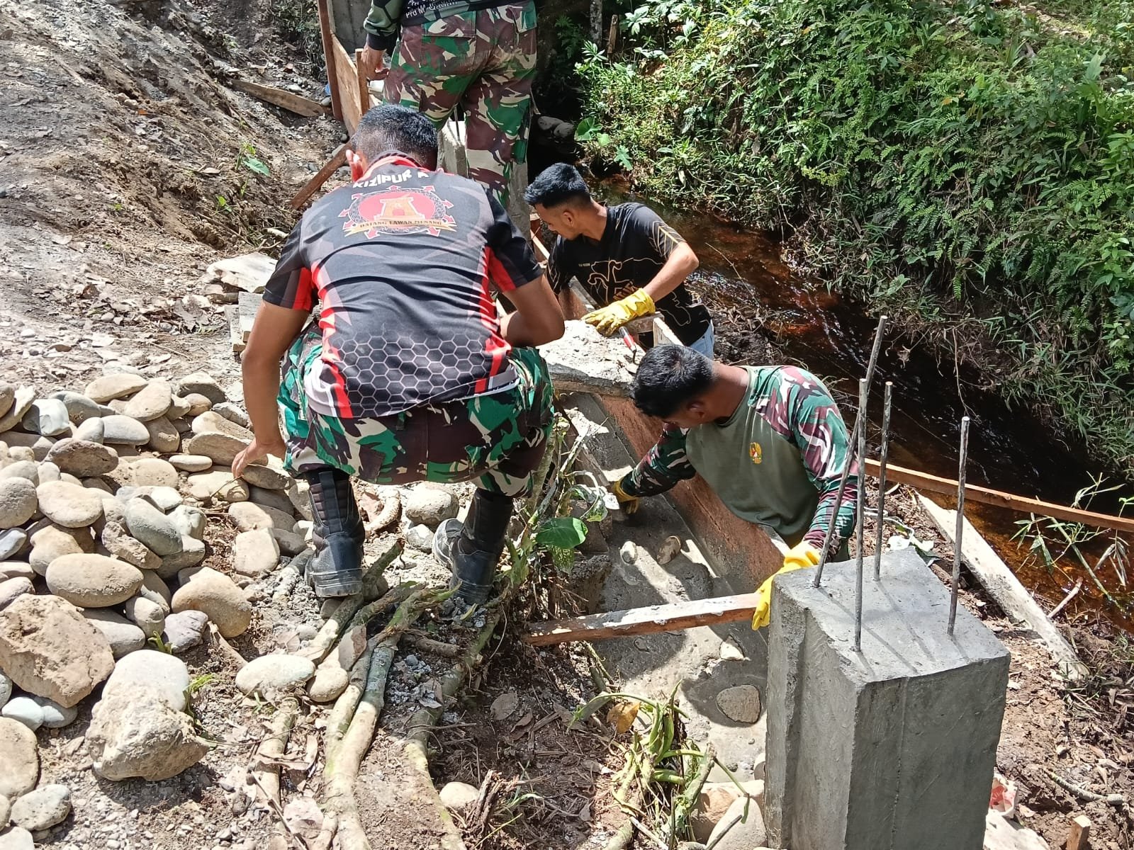 Pengecoran dinding wingwall dilakukan dengan tenaga dan hati. Prajurit dan warga saling melengkapi, menyatukan kekuatan dalam satu irama gotong royong.