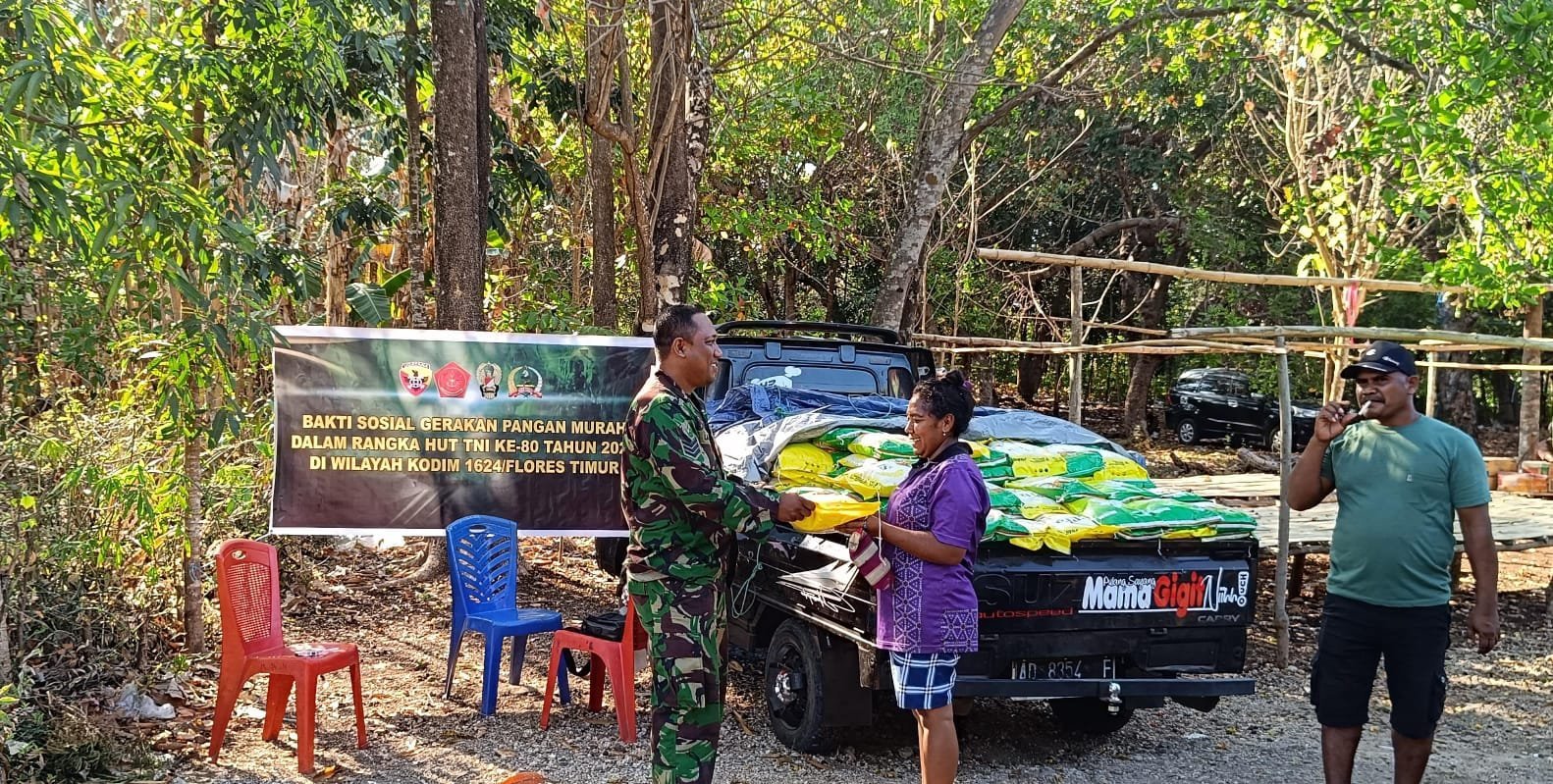 Riangpuho, Flotim – Dalam rangkaian peringatan HUT ke-80 TNI, Kodim 1624/Flores Timur bersama Perum BULOG Cabang Flores Timur melaksanakan kegiatan Gerakan Pangan Murah di Desa Riangpuho, Kecamatan Tanjung Bunga, Kabupaten Flores Timur, Kamis (2/10/2025).