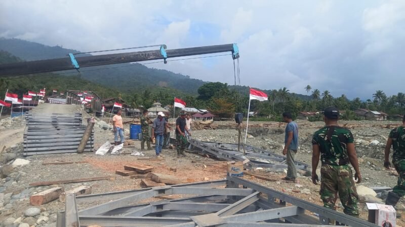 Nagan Raya – Prajurit TNI dari Kodim 0116/Nagan Raya bersama Yonif TP 856/SBS dan Satuan Zeni Kodam Iskandar Muda (Zidam IM) terus mempercepat pemasangan Jembatan Bailey di Kecamatan Beutong Ateuh Benggalang, Kabupaten Nagan Raya, Selasa (30/12/2025).