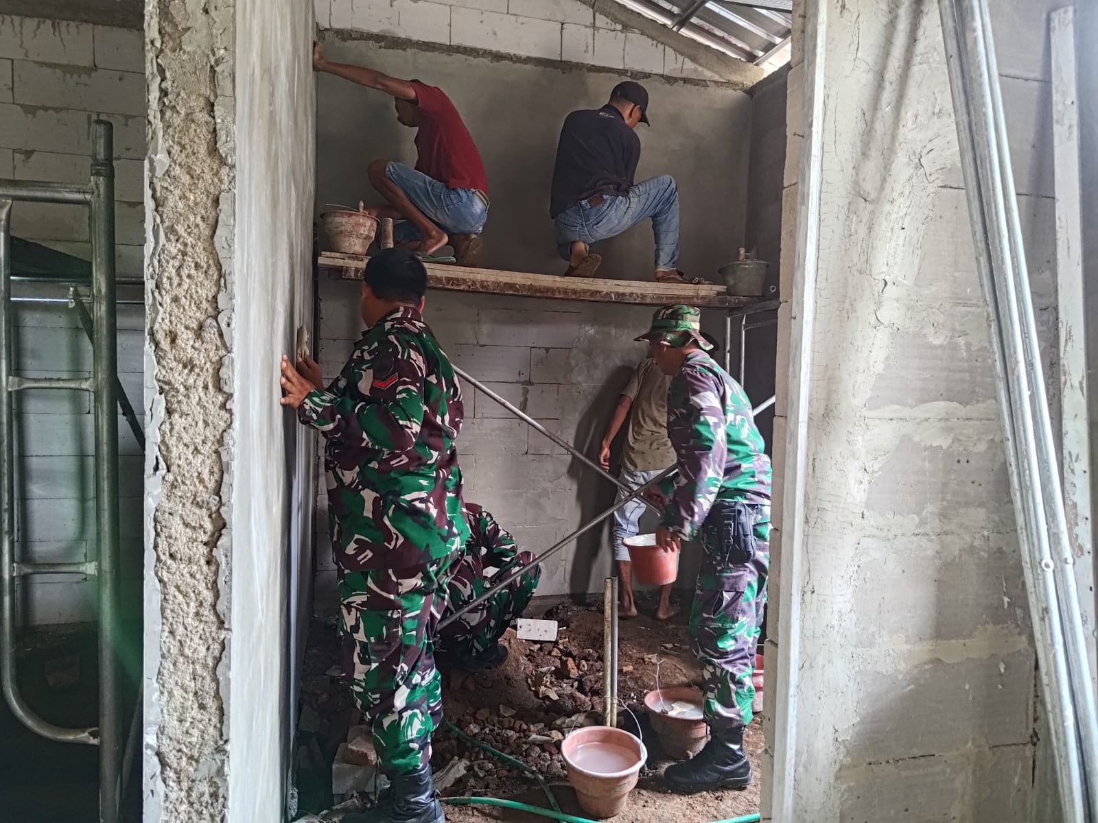Proses ini dilakukan secara gotong royong antara anggota Satgas TMMD dan masyarakat sekitar. Suasana kerja penuh kebersamaan pun terlihat di sela-sela pengerjaan. Dengan cekatan, prajurit TNI mengaduk semen, menyapu dinding, dan mengoleskan plester, memastikan dinding rumah tersebut tertutup rapat dan kuat.