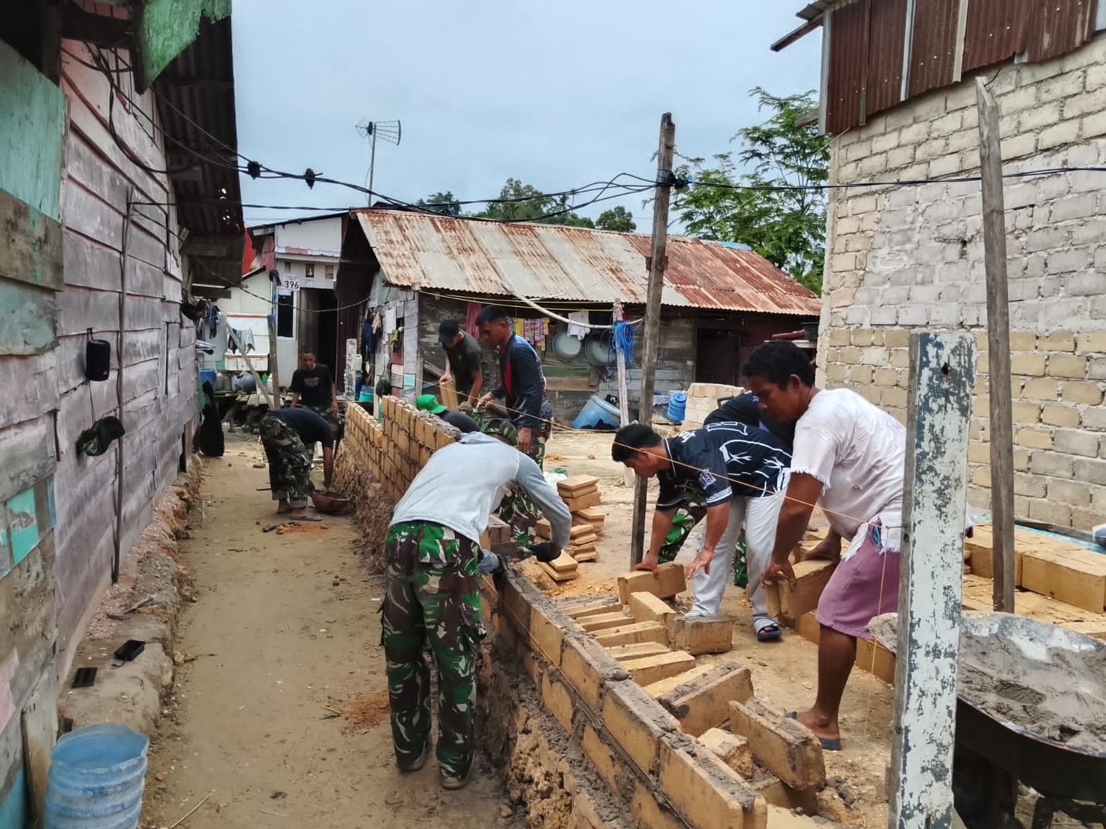 Anggota Satgas bersama masyarakat setempat terlihat bekerja sama dalam memasang dinding batako, yang merupakan langkah krusial dalam proses perbaikan rumah ini. Proses pemasangan dinding ini adalah fondasi utama dalam mewujudkan hunian yang lebih aman dan sehat bagi keluarga yang menerima bantuan.