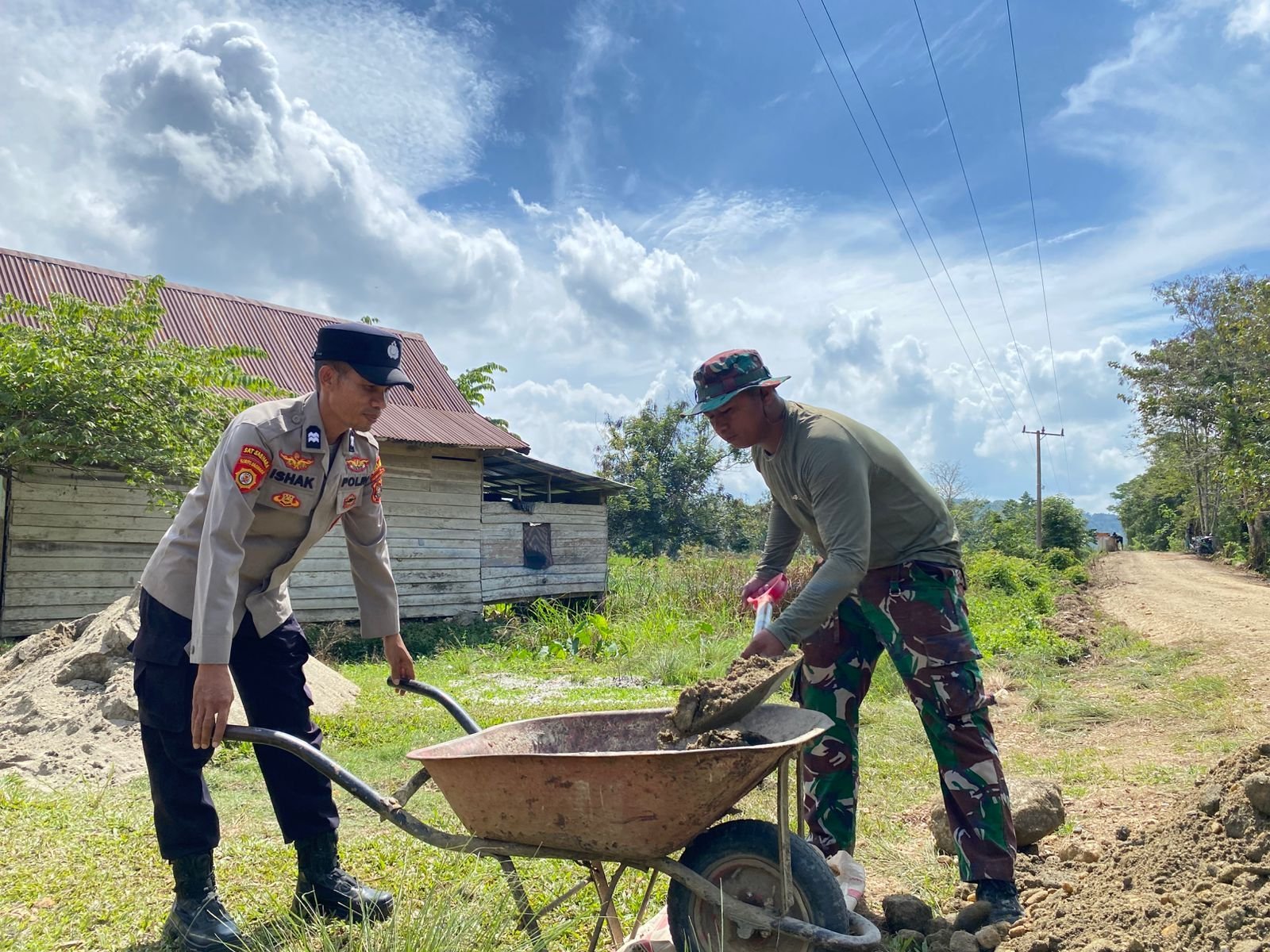 Konsel – Semangat kebersamaan mewarnai pembangunan tugu TMMD 125 Kodim 1417/Kendari yang terletak di pertigaan Desa Awua Jaya, Kecamatan Asinua, Kabupaten Konawe, Selasa (12/8). Proyek ini dikerjakan bersama oleh personel TNI, Polri, dan warga setempat.