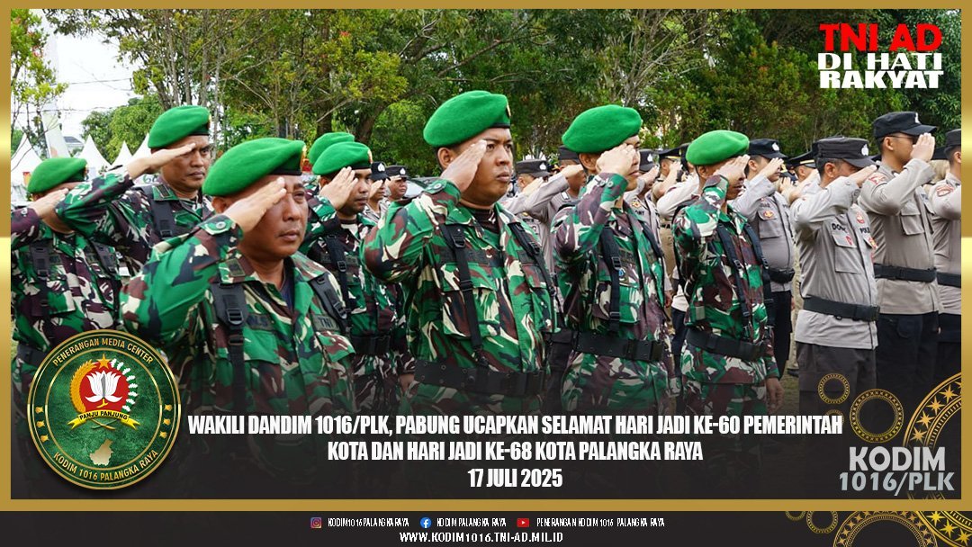 Palangka Raya – Bertempat di halaman Kantor Walikota Palangka Raya Jalan Tjilik Riwut Km, 5.5 Kelurahan Bukit Tunggal Kecamatan Jekan Raya Kota Palangka Raya Provinsi Kalimantan Tengah, Perwira Penghubung (Pabung) Gunung Mas Kodim 1016/Palangka Raya Letkol Inf Mahsun Abadi,S.Ag menghadiri Upacara Peringatan Hari Jadi ke-60 Pemerintah Kota dan Hari Jadi ke-68 Kota Palangka Raya, Kamis (17/07/2025).