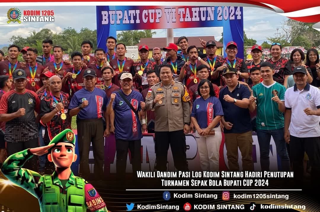 Sintang – Pasi Log Kodim 1205/Sintang Lettu Inf Paulinus mewakili Komandan Kodim Sintang menghadiri Penutupan Turnamen Sepak Bola Bupati CUP 2024, kegiatan tersebut dilaksanakan di Stadion Baning Sintang, Kelurahan Baning Kota, Kecamatan Sintang, Kabupaten Sintang, Jumat (20/12/2024) kemarin.