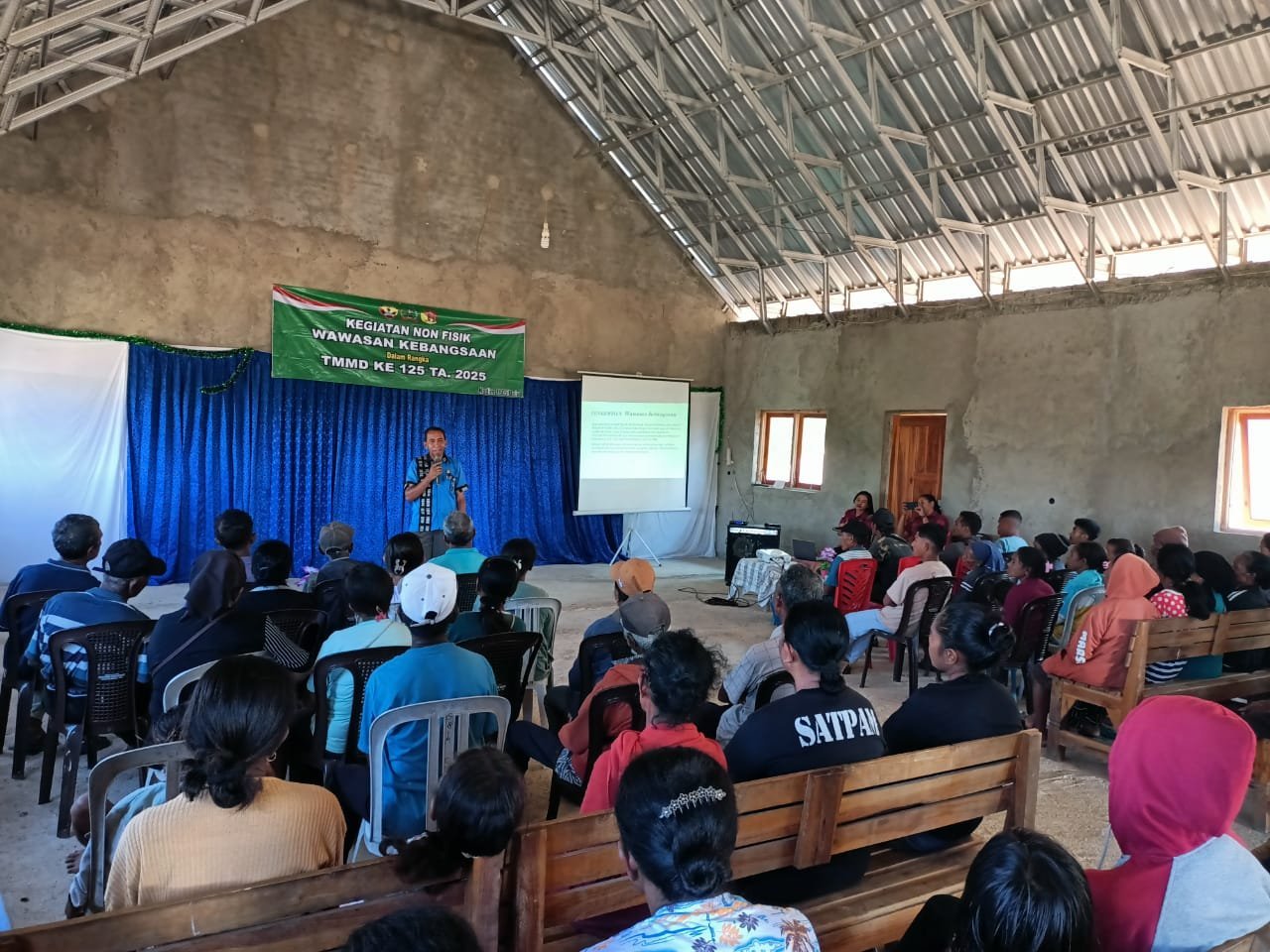 Belu – Warga Desa Naekasa, Kecamatan Tasifeto Barat, mendapatkan bekal wawasan kebangsaan dari Satgas TMMD ke-125 Kodim 1605/Belu yang bekerja sama dengan Kesbangpol Kabupaten Belu, Selasa (19/8/2025).