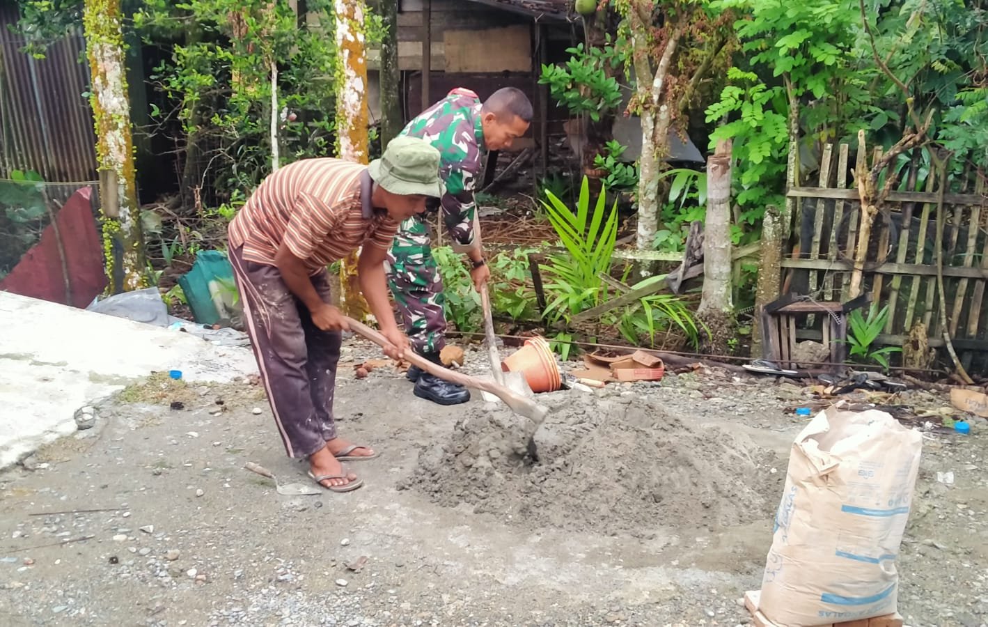 ACEH BARAT – Babinsa Koramil 03 Kaway XVI Serma Suyatno melaksanakan karya bakti membantu aduk semen untuk plaster dinding rumah milik warga binaan di Desa Alue Pedeng, Kecamatan Kaway XVI, Kabupaten Aceh Barat. Minggu (19/01/2025).