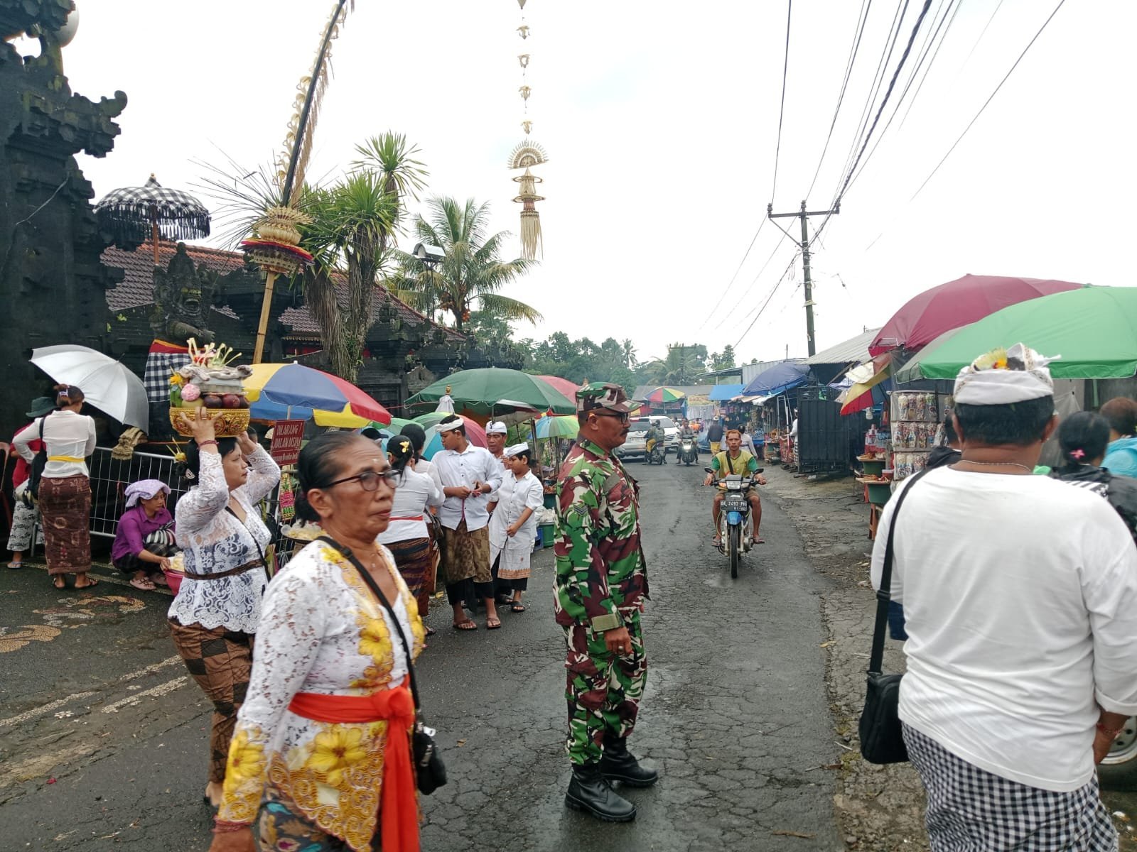 Babinsa bersama Pecalang Banjar adat setempat mengamankan dan mengatur lalu lintas demi lancarnya kegiatan upacara Dewa Yadnya tersebut