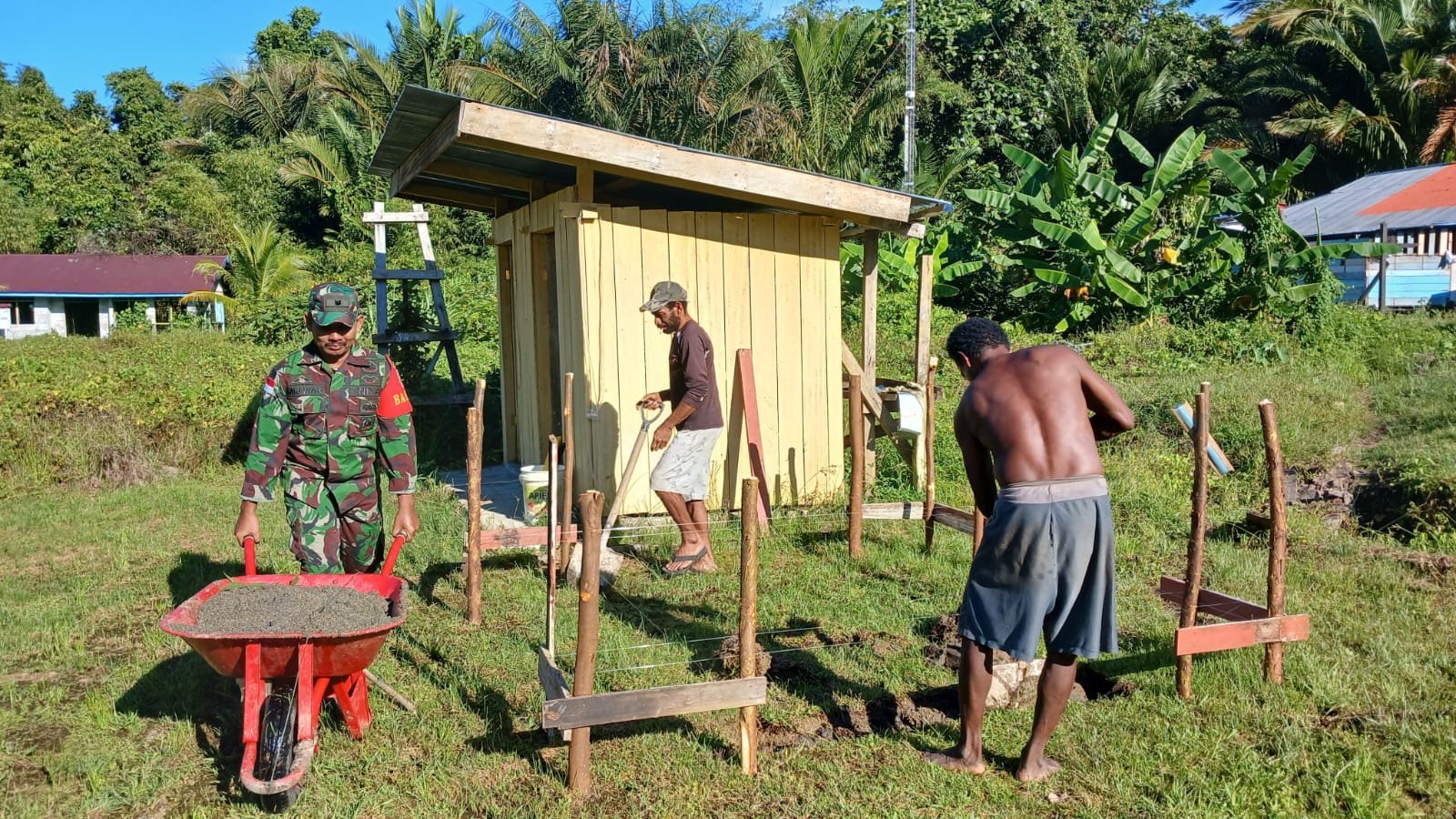 Nabire – sebagai bentuk kepedulian terhadap lingkungan dan kesejahteraan warga binaan, Babinsa Koramil 1705-03/Kwatisore (Serka Miswar) bantu pembuatan MCK yang bertempat di Kampung Simbokeri, Distrik Yaur, Kabupaten Nabire, Provinsi Papua Tengah.