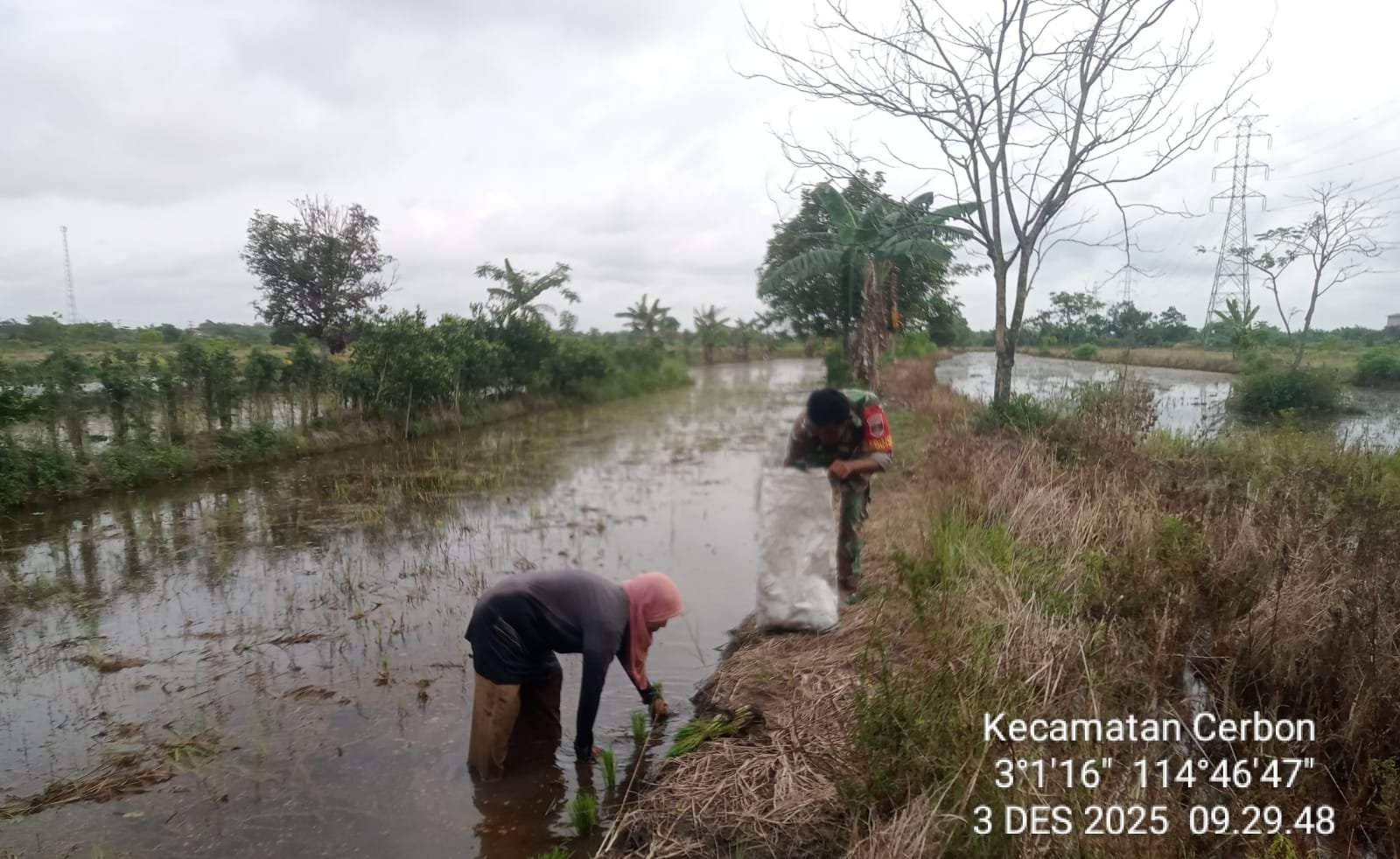 Barito Kuala — Dalam upaya mendukung program ketahanan pangan nasional dan meningkatkan produktivitas hasil pertanian di wilayah desa binaan, Babinsa Koramil 1005-04/Cerbon Serka Samsuddin, melaksanakan pendampingan kegiatan Luas Tambah Tanam (LTT) bersama para petani di Kecamatan Cerbon, Kabupaten Barito Kuala, pada Rabu, 3 Desember 2025.